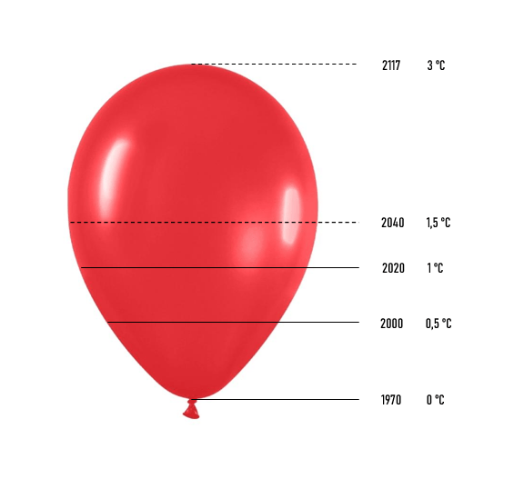 Hoe lang duurt het nog voordat de ballon knapt? Hoeveel tijd hebben we nog? Onze atmosfeer is als een ballon die zich vult met broeikasgassen en door deze broeikasgassen warmt onze aarde op. Zolang wij broeikasgassen produceren, blijft de ballon zich vullen. Er zijn mogelijkheden om broeikasgassen uit de atmosfeer te halen en daarmee uit de ballon te laten ontsnappen. Zo nemen bomen broeikasgassen op uit de atmosfeer. Vooralsnog hoopt de hoeveelheid broeikasgassen zich sneller op dan dat er gassen uit de atmosfeer worden opgeslagen. De ballon is een aardig eind gevuld, waardoor we wereldwijd een gemiddelde temperatuurstijging kennen van 1 graad in 2020 (zie Figuur 7). Deze temperatuurstijging is in 50 jaar tijd bereikt. Wanneer het huidige tempo van opwarming zich doorzet, dan is over ongeveer 97 jaar, in het jaar 2117, de temperatuur gestegen tot 3 graden. Vanaf dit moment is de stijging van de temperatuur onomkeerbaar. Zodra we deze kritieke drempel halen, knapt de ballon.