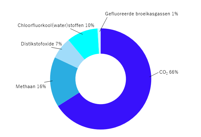 Het betreft honderden aan mogelijke maatregelen. In één woord wordt deze overgang de energietransitie genoemd. De energietransitie is wereldwijd onze oplossing voor het probleem klimaatopwarming. Het gaat uit van het idee dat we met nieuwe technieken en aanpassing van bestaande technieken de uitstoot van broeikasgassen kunnen reduceren. Opvallend is dat de meeste maatregelen en metingen van het effect van maatregelen gericht zijn op CO2 uitstoot en dat de andere broeikasgassen veel minder aandacht krijgen. Om een beeld te geven van de broeikasgassen, zie je in Figuur 8 de verdeling aan broeikasgassen. Twee derde van de uitstoot betreft CO2, veruit het belangrijkste broeikasgas. Daarna volgen methaan met 16%, distikstofoxide met 7%, chloorfluorkool(water)stoffen met 10% en gefluoreerde broeikasgassen met 1%.