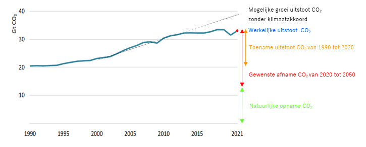 Het hoogtepunt van de wereldwijde uitstoot van CO2 hebben we nog niet bereikt (zie de blauwe lijn in Figuur 9). De klimaatakkoorden hebben enig effect, want de groei van de uitstoot is aan het stagneren (zie de blauwe lijn t.o.v. de zwarte stippellijn). Het hoogtepunt in de uitstoot bereiken voor 2030 is mogelijk. De opgave daarna is flink. Het houdt in dat we de toename in uitstoot in de afgelopen 30 jaar anderhalf keer terugdraaien in ongeveer dezelfde tijdspanne om uit te komen tot CO2 neutraal (zie de rode pijl t.o.v. de oranje pijl). De rest van de CO2 uitstoot, ongeveer 40%, wordt door de natuur opgenomen (zie de groene pijl) (Neufeld & Smith, 2022) (Penke, 2021). Zolang we de natuur niet meer schade toebrengen.