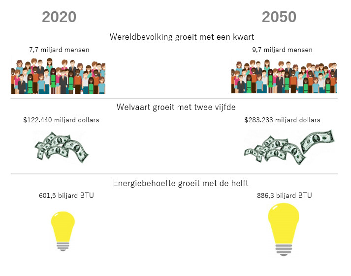 In 2050 zullen we met zo’n 10 miljard mensen zijn ten opzichte van de huidige bijna 8 miljard mensen. Deze groei van de wereldbevolking van 2 miljard is een toename van een kwart (circa 25%). De welvaart van die 10 miljard mensen zal toenemen met twee vijfde, circa 40%. Uiteindelijk is de verwachting dat onze energiebehoefte met ongeveer de helft zal zijn toegenomen in 2050. De opgave die voor ons ligt is bijzonder moeilijk en wordt met de dag moeilijker.