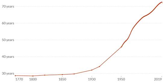 In korter dan 2 eeuwen is de wereldbevolking waanzinnig gegroeid. In dezelfde periode is de levensverwachting meer dan verdubbeld. Tussen 1770 en 1870 was de gemiddelde levensverwachting in de wereld 30 jaar (zie Figuur 17). Na 1870 is de levensverwachting exponentieel gegroeid naar gemiddeld 73 jaar in 2019 (Roser, Ortiz-Ospina, & Ritchie, Life Expectancy, 2013, last revised in 2019). De toename is een gevolg van de grotere voedselproductie en distributie, van de verbetering in gezondheid door beschikbaarheid van schoon water en sanitair en van de betere medische technologie zoals vaccinatie en antibiotica (Segue_Technologies, 2015).