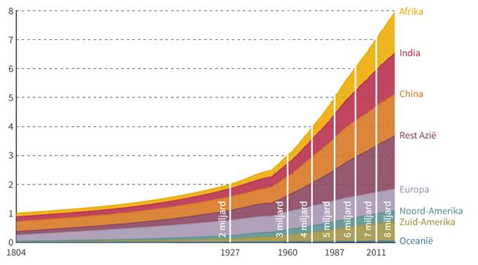Het is ongelooflijk wat voor een groei de wereldbevolking heeft doorgemaakt. Slechts 200 jaar geleden, dus rond 1800, waren er maar 1 miljard mensen op de aarde (zie Figuur 14). Het heeft 2 miljoen jaar geduurd om te groeien naar deze eerste miljard mensen. Inmiddels zijn we twee eeuwen verder en is de bevolking gegroeid met 7 miljard mensen naar een wereldbevolking van 8 miljard mensen. Met zo verschrikkelijk veel mensen is onze wereld heel erg groot geworden.